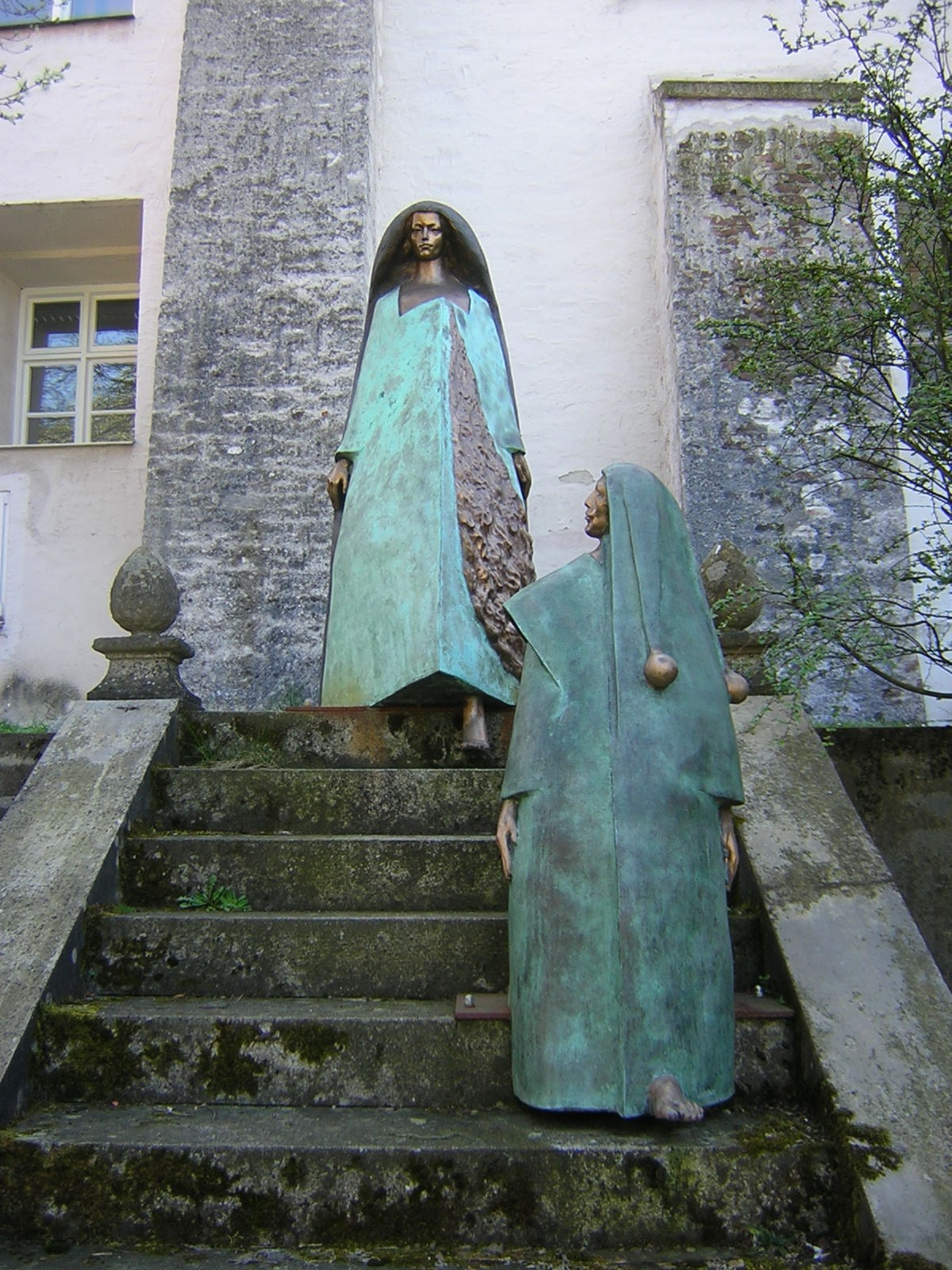 Im Garten steht eine lebensgroße Figur der Agnes Bernauer, gestaltet von Christoph Pommer. Sie trägt Türkis und Bronze und schaut auf den Weltennarr, der sie zu fragen scheint: "Mensch, Bernauerin, glaubst Du wirklich an die Liebe?" Sie schaut an ihm vorbei, schreitet hinab auf ihr Schicksal zu.